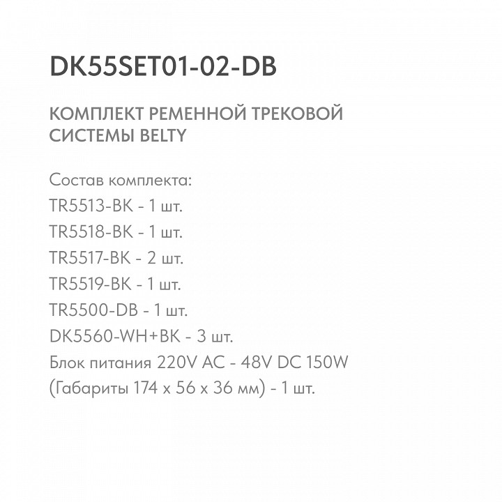 основание TR5513-BK - 1 шт., крепеж крепеж TR5518-BK - 1 шт., крепеж TR5517-BK - 2 шт., крепеж TR5519-BK - 1 шт., шинопровод TR5500-DB - 1 шт., светильник DK5560-WH+BK - 3 шт., блок питания 220V AC - 48V DC 150W (Габариты 174 x 56 x 36 мм)
