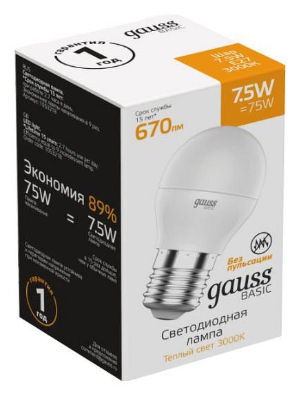 Лампа светодиодная Gauss Basic E27 7.5Вт 3000K 1053218