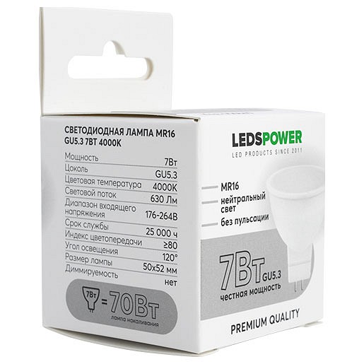 Лампа светодиодная LEDS POWER GU5.3 7Вт 4000K 006840