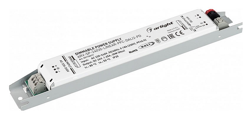 Встроенный PFC >0.92. Негерметичный алюминиевый корпус IP 20. Габаритные размеры длина 230 мм, ширина 30 мм, высота 21 мм. Гарантийный срок 5 лет.