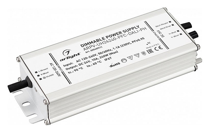 Встроенный PFC >0.95. Герметичный алюминиевый корпус IP 67. Рабочая температура -40…+70C⁰. Габаритные размеры длина 188 мм, ширина 67.5 мм, высота 38.5 мм. Гарантийный срок 7 лет.