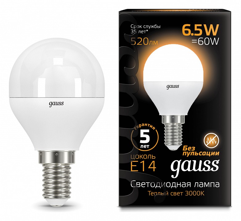 Лампа светодиодная Gauss E14 6.5Вт 3000K 105101107