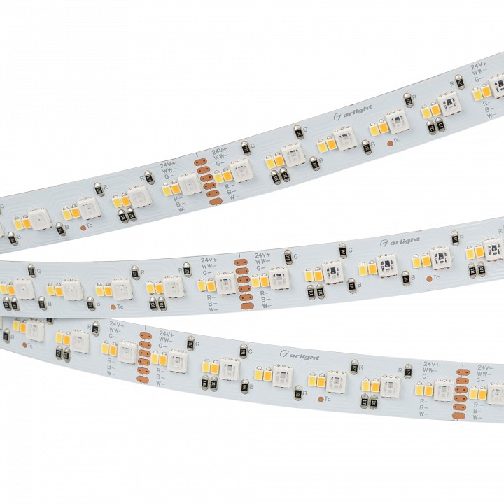 что позволяет получить не только любой оттенок белого свечения от теплого до холодного, но и любой другой цвет свечения. Светодиоды SMD 3838 и SMD 2216 (288 шт/м): теплый белый (2700 К), холодный белый (6000 К) и RGB. Мощность 19.2 Вт/м, напряжение питания 24 В. Декоративная мультицветная подсветка ниш, элементов интерьера. Рекомендуется установка на профиль. Минимальный отрезок 62.5 мм (18 светодиодов).