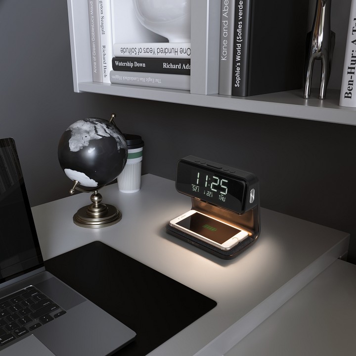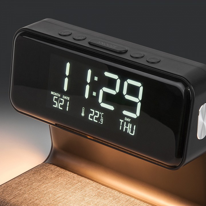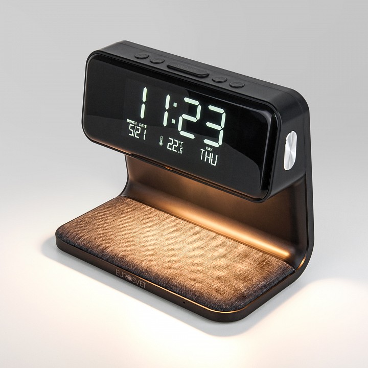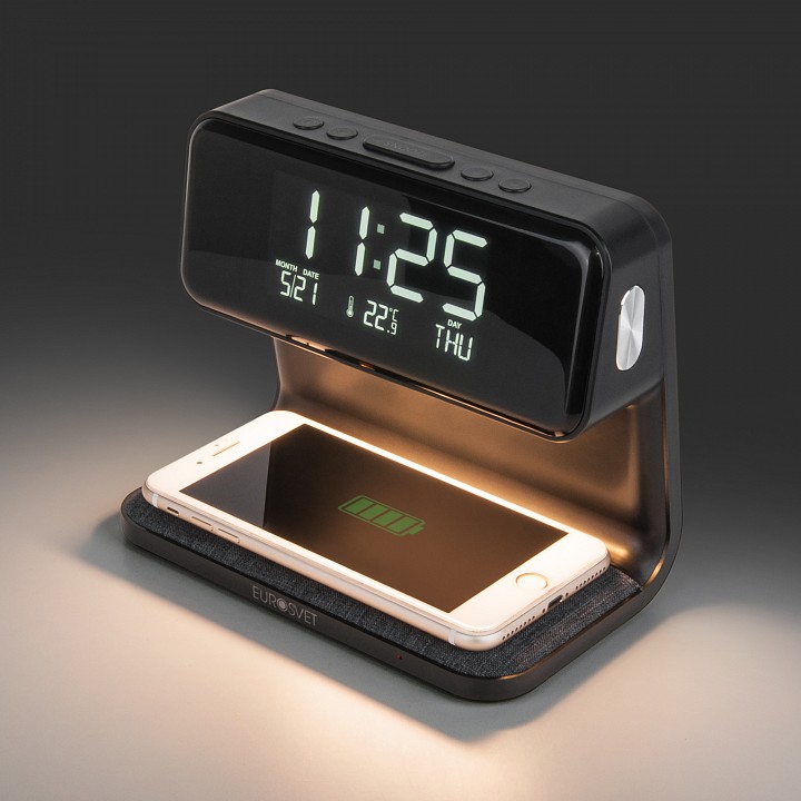 будильник, беспроводное зарядное устройство для смартфонов, календарь, провод электропитания с вилкой без заземления, термометр, часы